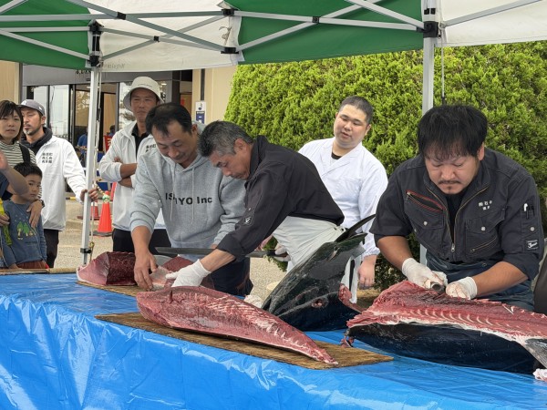たくさんのイベントやキッチンカーが並ぶなどし、大変賑わっておりました。私たちもマグロの解体ショーを任され、当日は約80kgのマグロを解体させて頂きました。ショーが始る随分前から、沢山の観客の方が場所取りをされ、初めて見るマグロの魚体に、子供たちも興味津々。直に生のマグロに触れ、大はしゃぎの子供たちと、その後振舞われるマグロ丼が待ち遠しい家族の方々。